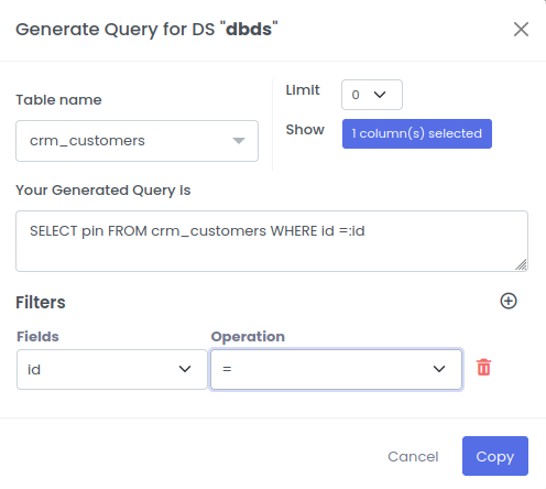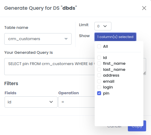 | Your Generated Query is | Data Base Query | SELECT pin FROM crm_customers WHERE id:id |
