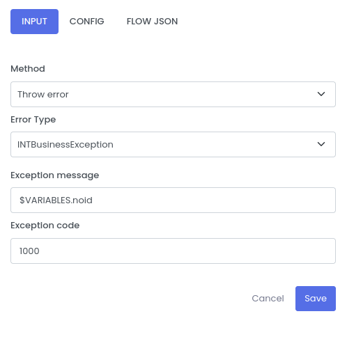 | Exception message | The custom message while throwing the custom Exception | $VARIABLES.noid |