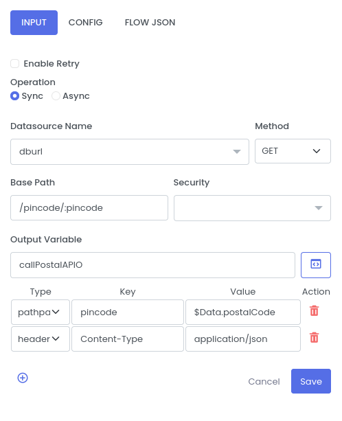 | pathparams | Path parmeter for REST call | pincode | $Data.postalCode |