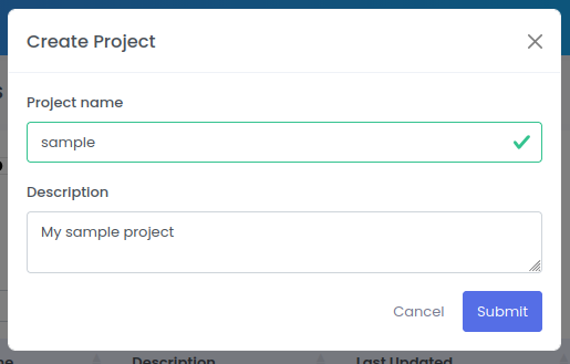 Type the Project name and Description and click submit button to create the new project.