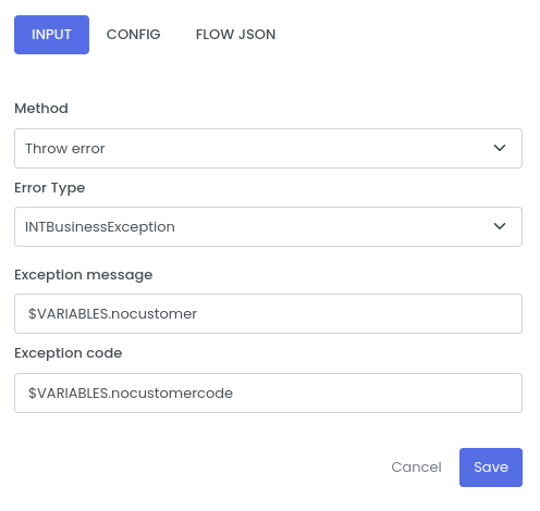 | Exception message | The custom message while throwing the custom Exception | $VARIABLES.nocustomer |