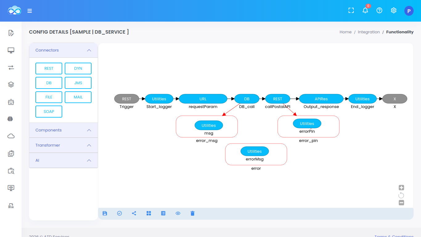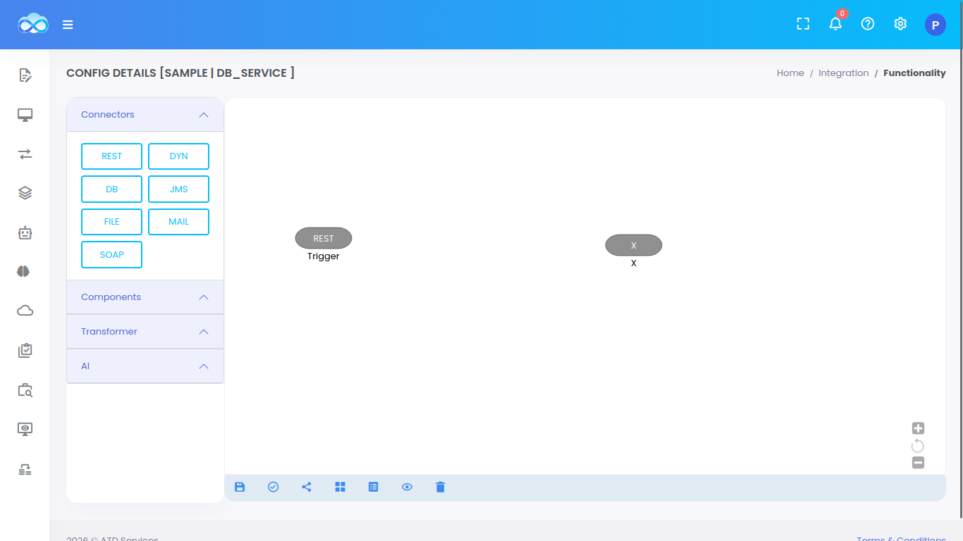 After the service is created, a canvas will show up to build the quickintegrate flow