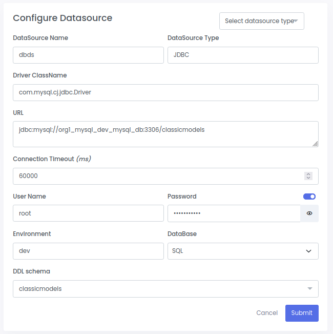 c. Configure the database datasource as below and click on Submit button