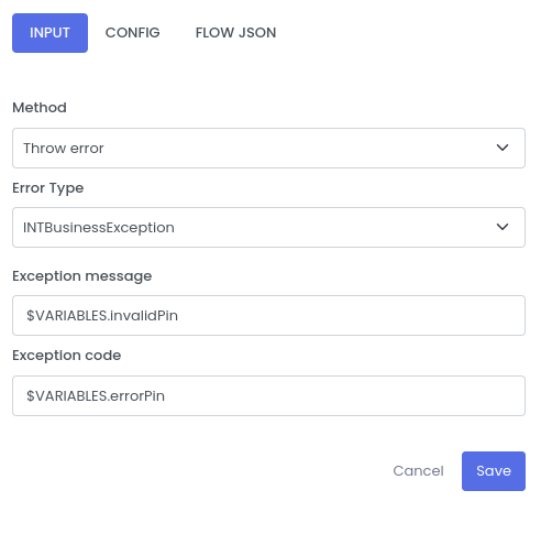 | Exception message | The custom message while throwing the custom Exception | $VARIABLES.invalidPin |