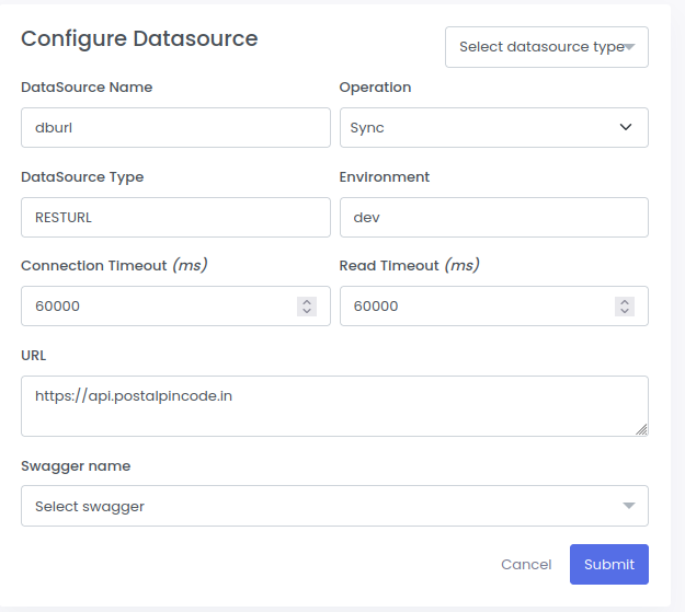 e. Configure the rest datasource as below and click on Submit button